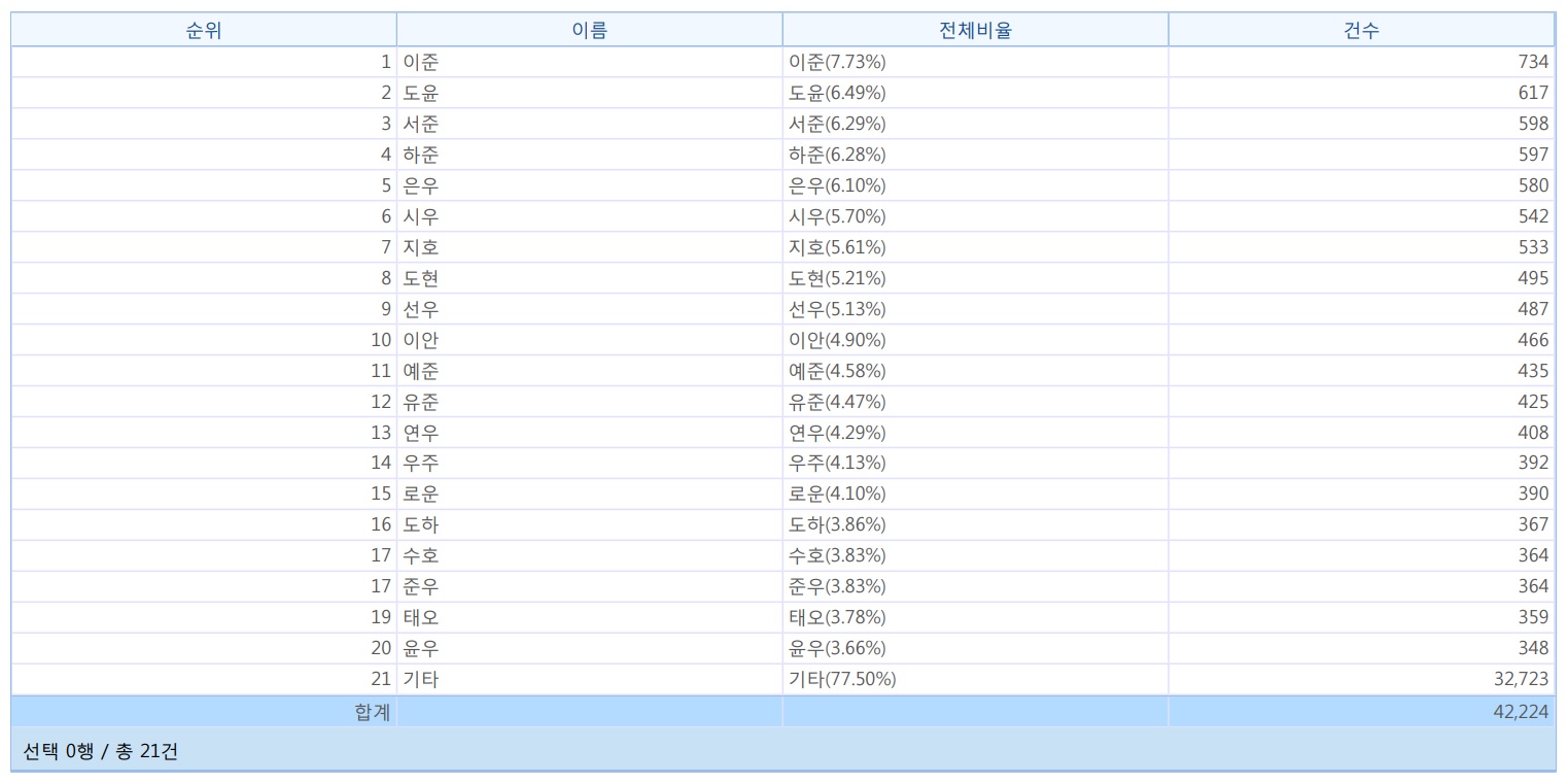 신생아 이름 통계조회의 결과는 아래와 같습니다.