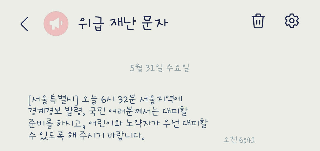 5월 31일인 오늘 6시 41분 위급 재난 문자가 난데없이 소리를 내며 아침을 깨웠습니다. 서울지역에 경계경보 발령. 인터넷 접속이 안돼서 뉴스를 켜보니 북한에서 남쪽방향으로 우주발사체를 발