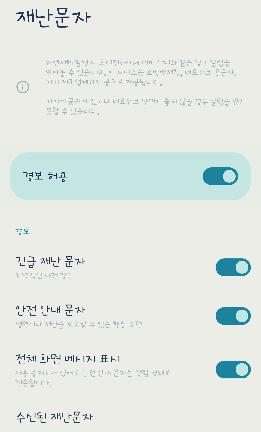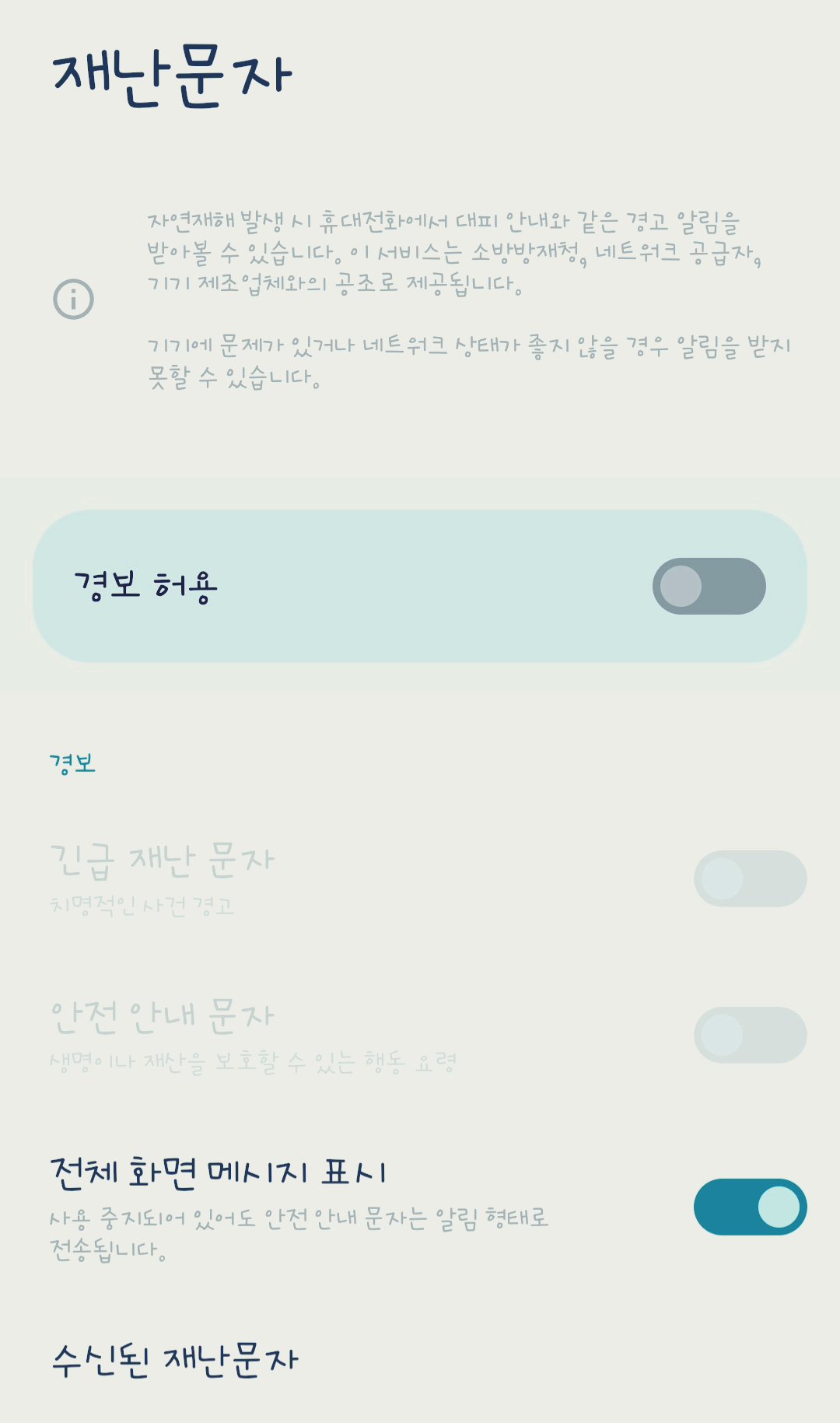 경보 허용에서는 긴급 재난 문자와 안전 안내문자를 개별적으로 허용 또는 차단할 수 있습니다.