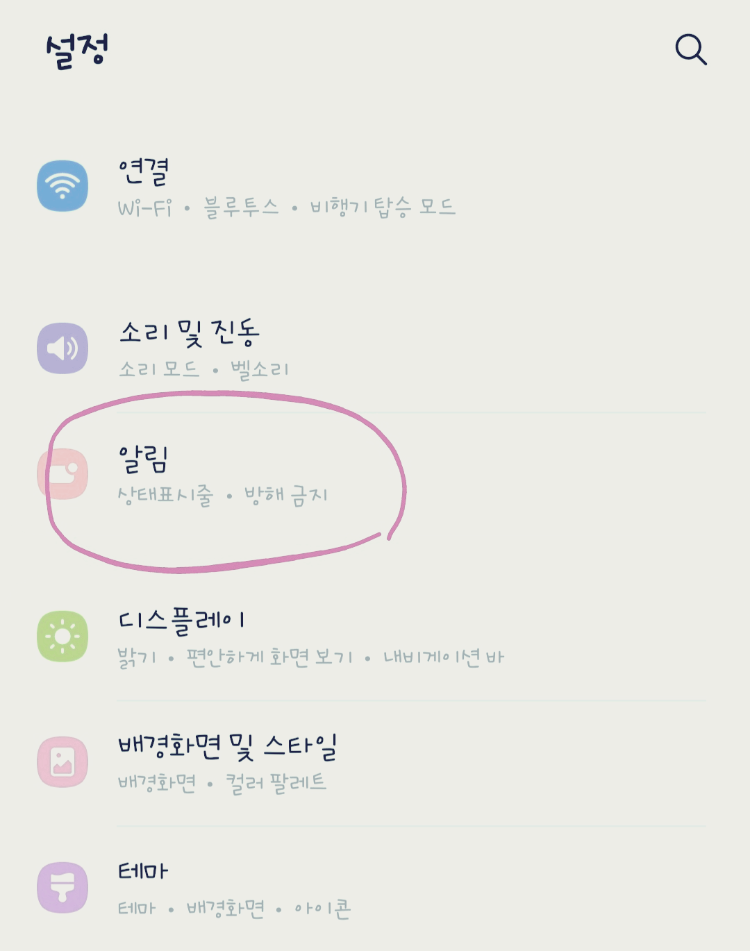 먼저 휴대폰 설정 앱에 들어가서 “알림”으로 들어갑니다.